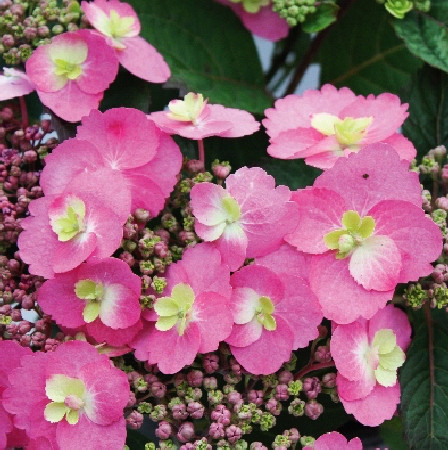 Саженцы Гортензии пильчатой Коттон Кэнди (COTTON CANDY, Hydrangea serrata) – это смесь гортензии крупнолистной и гортензии пильчатой. Невысокое малогабаритное растение, которое растет быстро, длиной 60-80 сантиметров. Гортензия имеет полушероховатые ярко-розовые с зеленоватой серединой соцветия. Цветение куста продолжается с июля по октябрь. Гортензия пильчатой Коттон Кэнди считается морозоустойчивым растением. Зимой не требует существенного укрытия, кроме мульчирования мульчей либо опилками. Хорошо приживается на солнце и в полутени. Предпочитает тепло, плодородный, влажный грунт и отсутствие извести. Подходит для групповых и одиночных посадок.