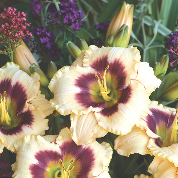 Лилейник гибридный Блюберри Кэнди (Blueberry Candy) ароматный, повторно цветущий многолетник. Цветки нежно-кремовые с фиолетовой глазной зоной и зеленым горлом, распускаются в июле. Этот сорт прекрасно сочетается со многими декоративными растениями и кустарниками. При посадке стоит выбирать хорошо освещенные места с плодородной, водопроницаемой почвой. Лилейник гибридный Блюберри Кэнди устойчив к холоду, засухе, негативным погодным условиям.