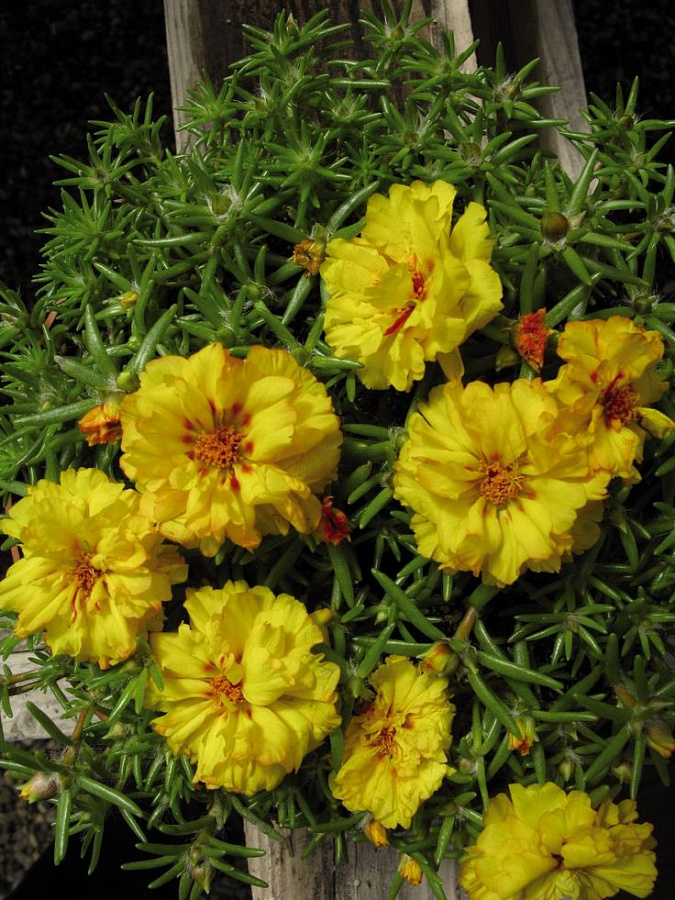 Листья портулака маленькие, зеленые, создают плотный ковер, который защищает корни от пересыхания. Это растение предпочитает солнечные места и песчаные почвы, поэтому выберите для него открытое место в саду. Поливайте портулак умеренно, избегая застоя влаги, и не забывайте подкармливать его удобрениями для обильного цветения.