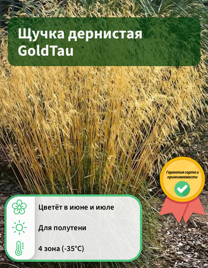 Рассада щучки дернистой Голдтау (Gold Tau) непривередлива и растёт даже в заболоченной местности. Предпочтение отдаёт скорее полутени, нежели палящему солнцу. Важно, чтобы было достаточное количество тепла и влаги. Листья тёмно-зелёные, заострённые. На стеблях пушистые кисточки золотистого цвета. Производят впечатление пышных облаков, выросших посреди зелени. Размеры стебля бывают около 50 см. Длина кисточек примерно до 25 см. Сорт был выведен в Голландии.