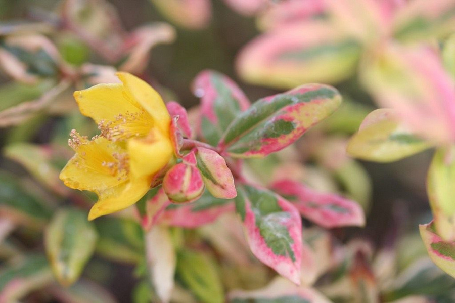 Саженцы зверобоя Триколор (Tricolor) имеют поникающие, изящные стебли и вырастают около 50 см в высоту. Побеги обладают ярко-красным тоном. Листики продолговатой формы, зеленого окраса с розовой каймой по краям. Цветет небольшими желтыми цветочками с июня по август. Цветение обильно покрывает кустик. Плюсы зверобоя Триколор: